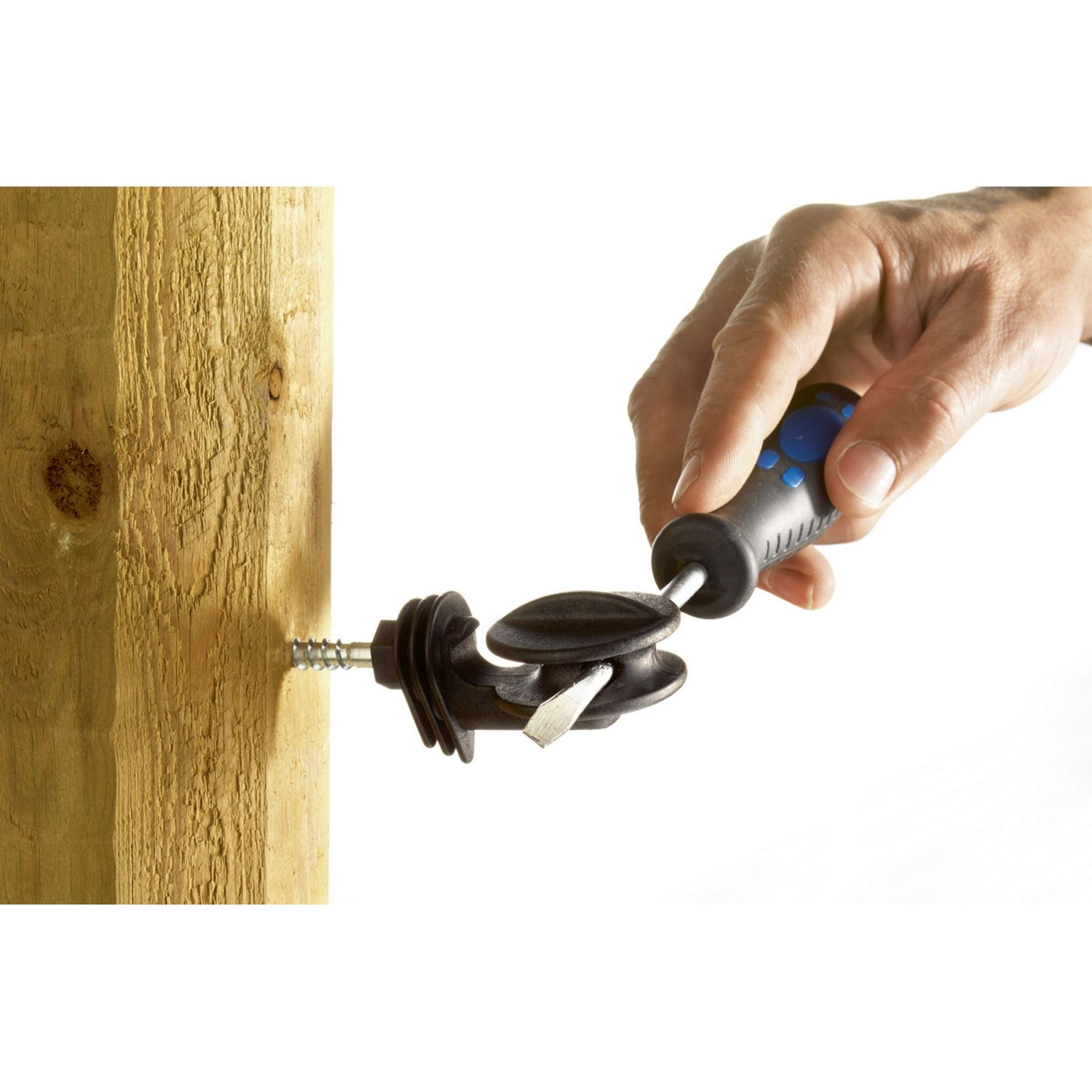 Durch die spezielle Form des Isolators bleibt das Leitermaterial sicher an seinem Platz und rutscht nicht am Metallträger ab. Zudem verhindert der hochisolierte Pfosten das Entstehen von elektrischen Entladungen. So bleibt die Spannung im Zaun stets konstant.
