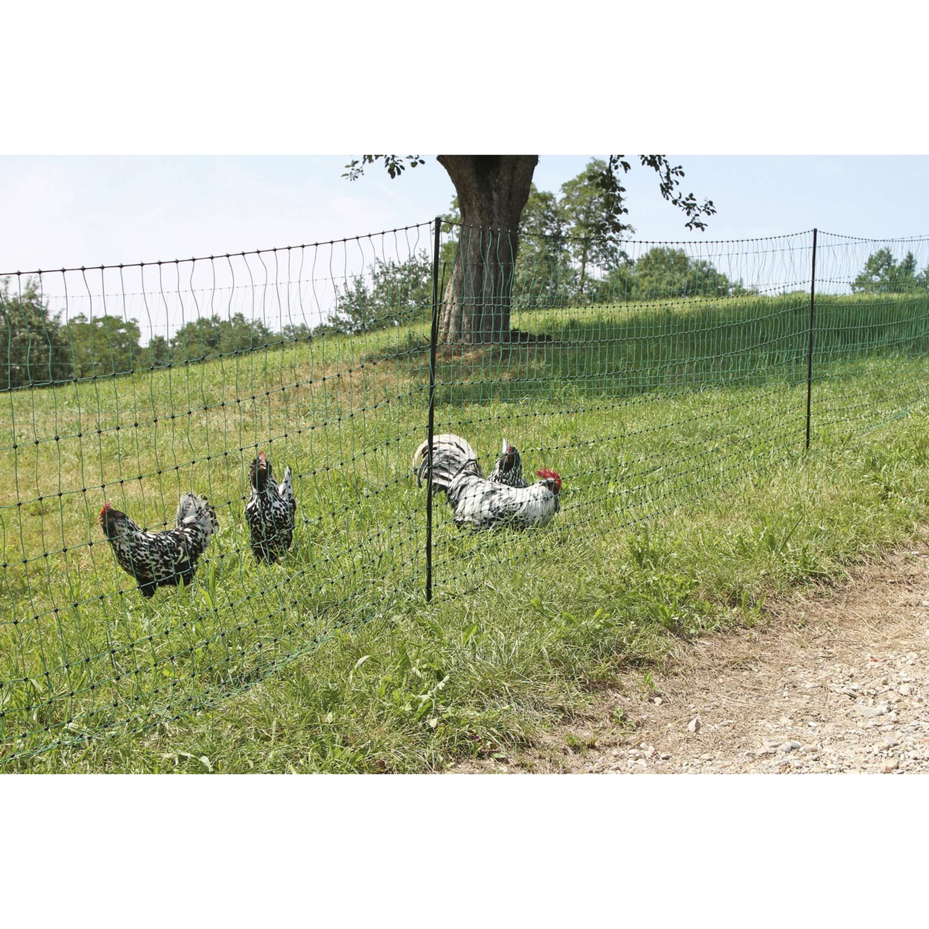 Dieses Netz besteht aus widerstandsfähigen Kunststoffpfosten, die mit verzinkten Bodenspitzen ausgestattet sind. So bleibt es stabil und widersteht den täglichen Herausforderungen auf deinem Hof.