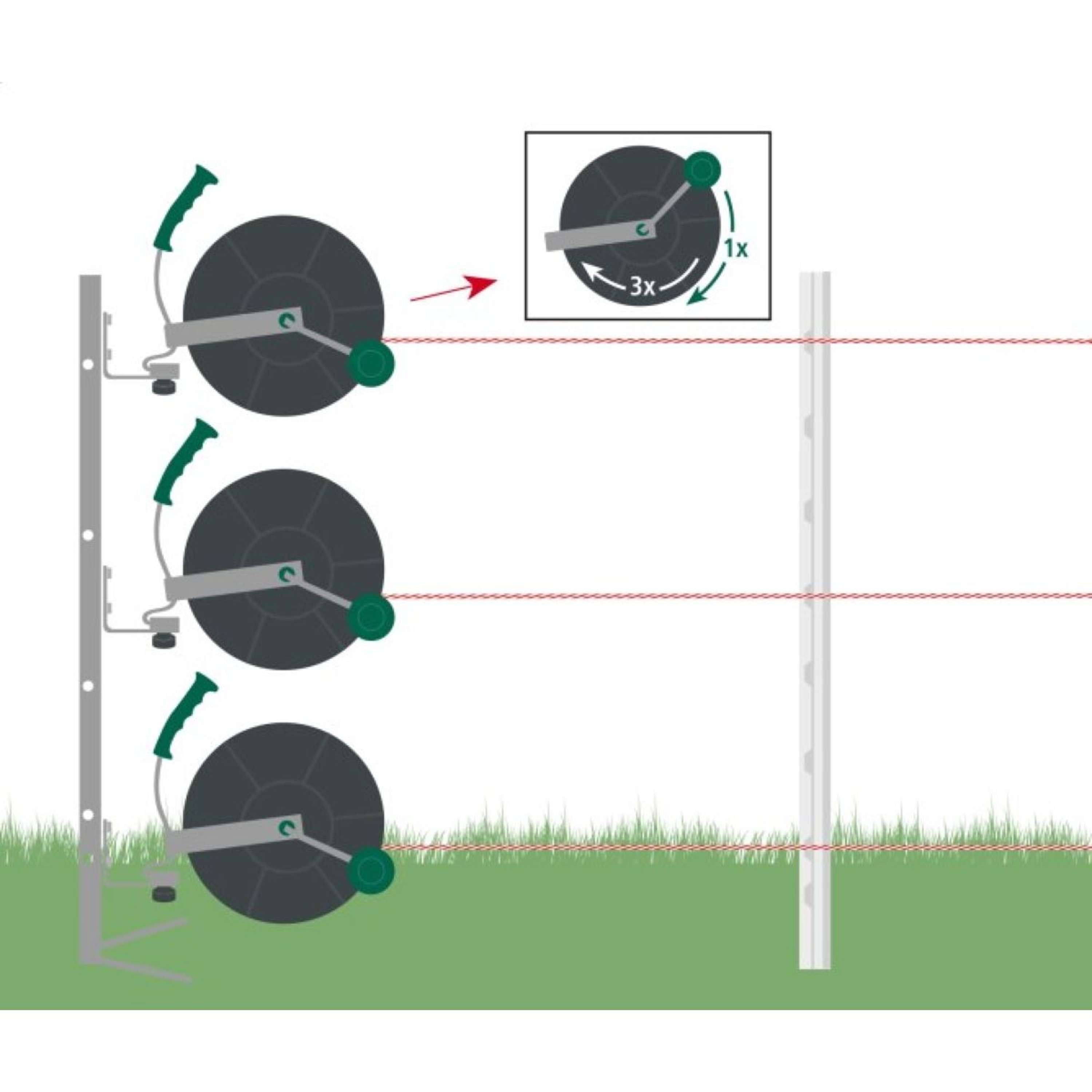 Mit der Geared reel 3-way transmission wird das Arbeiten auf dem Hof zum Kinderspiel. Diese Drahtspule sorgt für eine einfache und gut gelenkte Drahtführung.