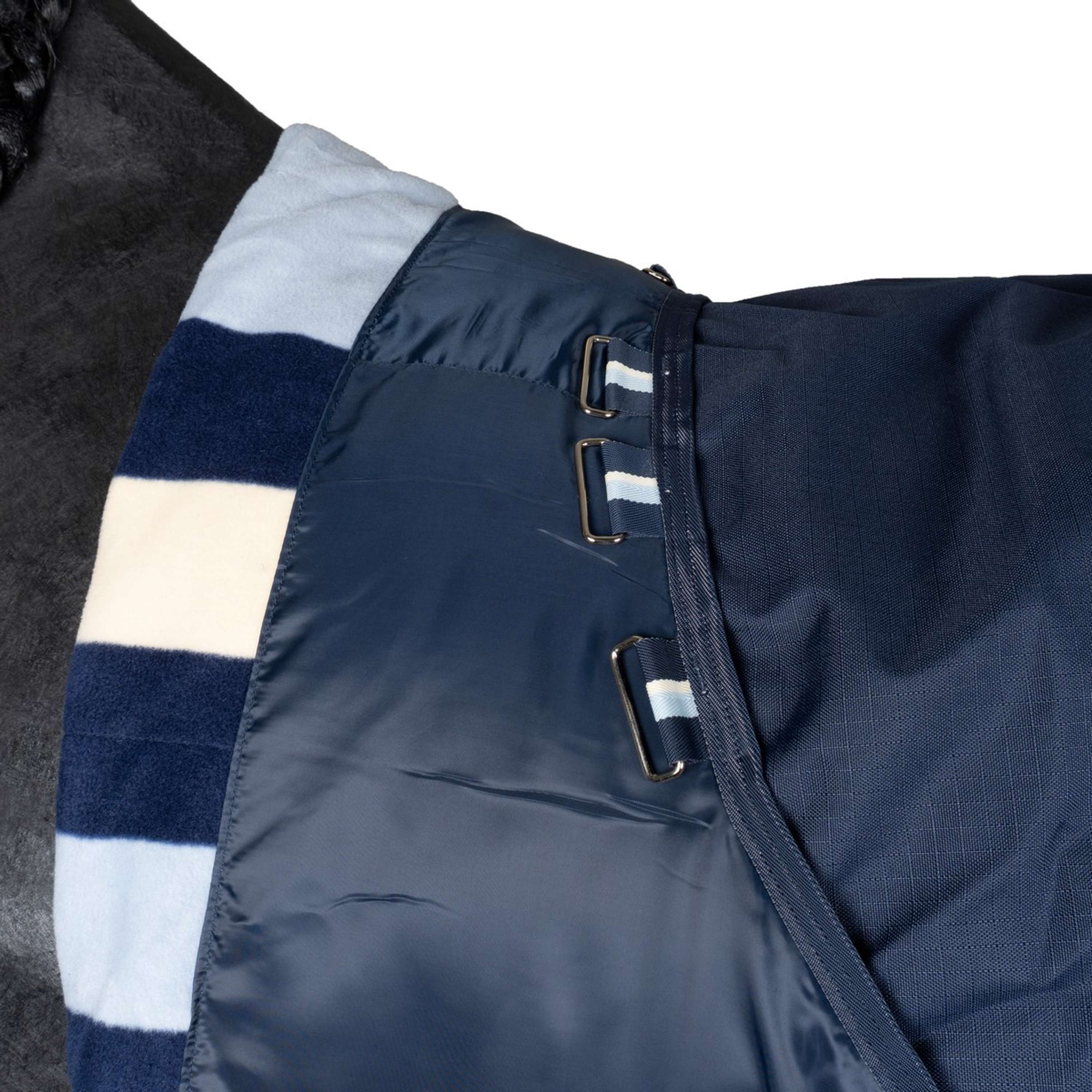 Kapuze und Innenfutterschlaufen sorgen für Flexibilität beim Gewicht der Decke, wenn sich die Jahreszeiten ändern. Klassischer gerader Frontverschluss und Kreuzgurte für einen sicheren Sitz. Kuscheliges und atmungsaktives Fleecefutter.