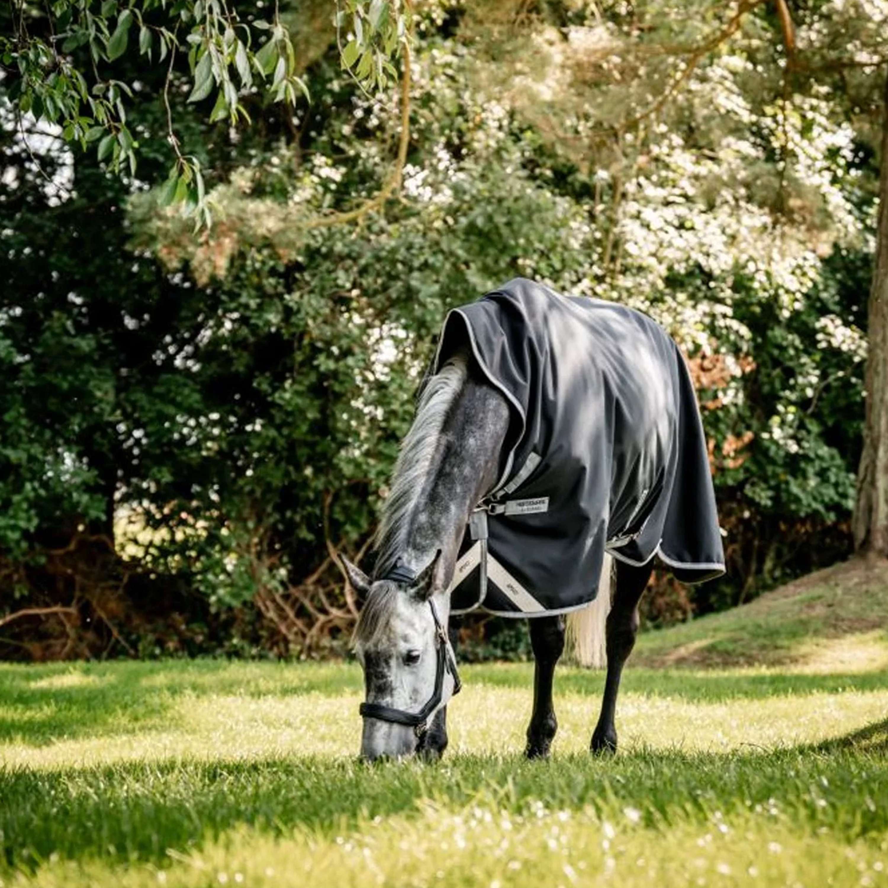 Ausgestattet mit einem V-Front-Verschluss, der den Druck auf die Schulter eliminiert und mehr Komfort beim Grasen ermöglicht. Doppelte Beinbögen, um die Bewegungsfreiheit zu erhalten und gleichzeitig zu ermöglichen, dass die Decke sicher unter dem Bauch bleibt. Reflektierende Streifen für erhöhte Sichtbarkeit und 3 Gurte.