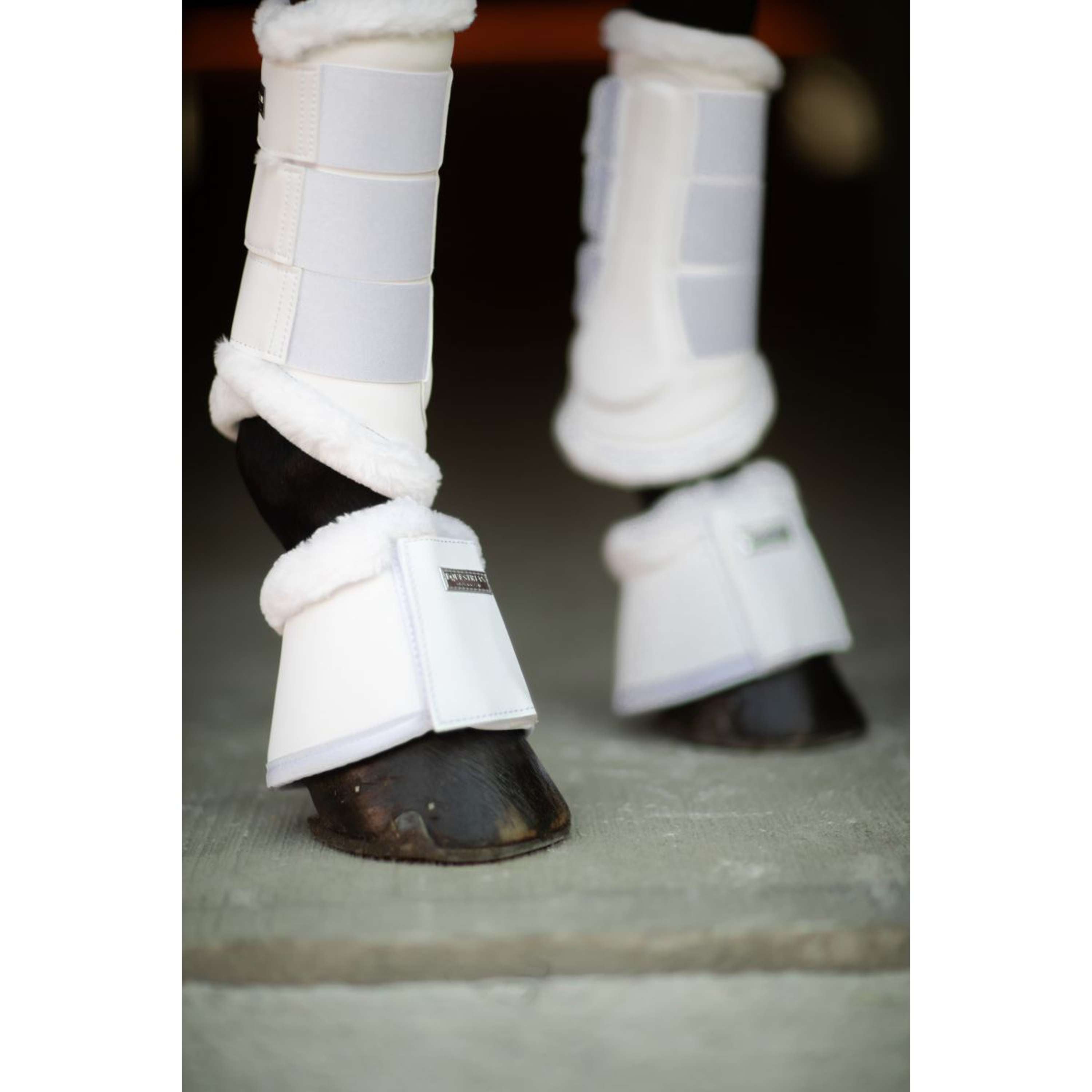 Habe Stil im Stall mit den Equestrian Stockholm Hufglocken aus glänzendem Kunstleder. Die weiße Farbe und das flauschige weiße Teddyfutter sorgen für einen schicken Look. Außerdem schützt das weiche Innenfutter die Beine deines Pferdes.