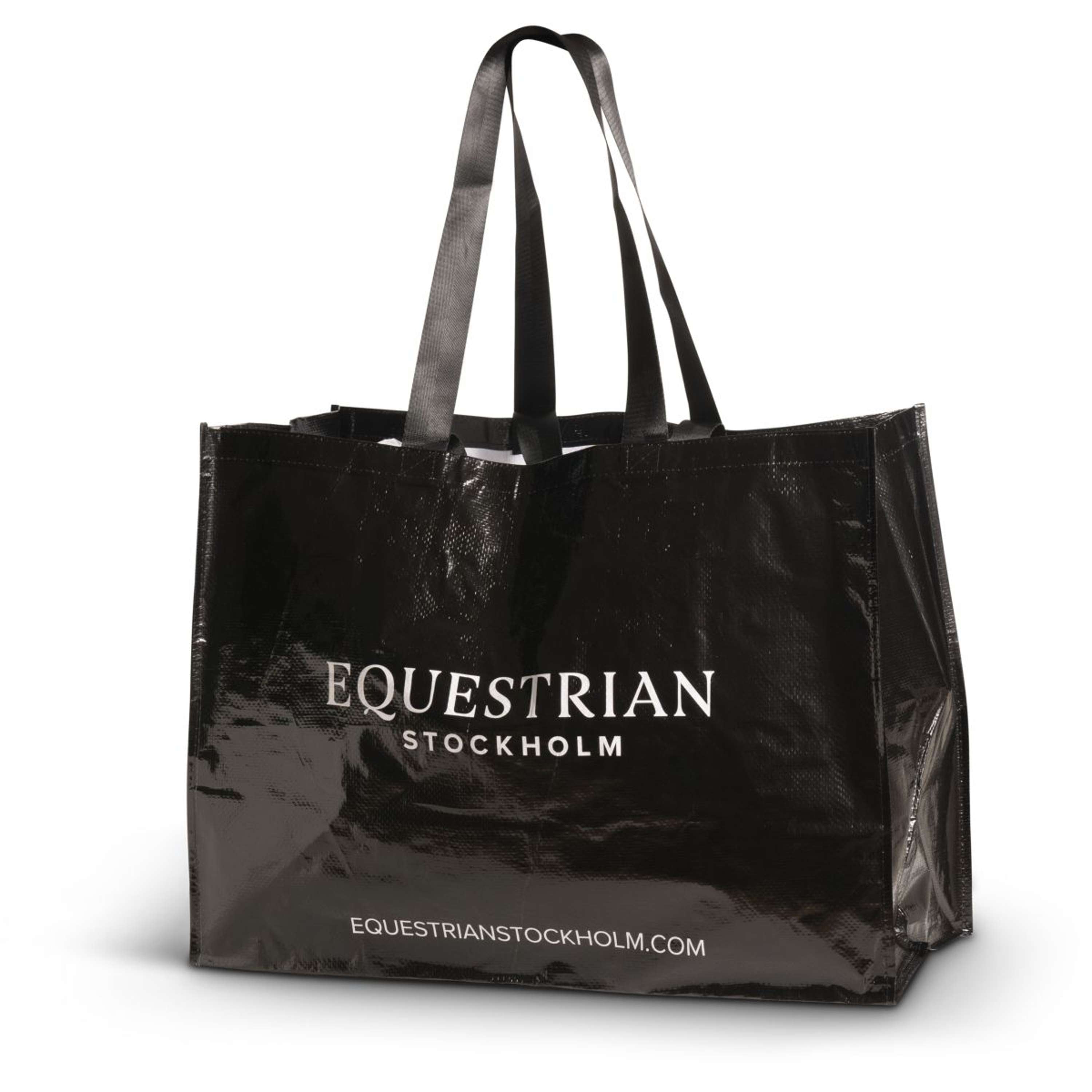 Bestelle die schwarze Tasche mit einem stilvollen weißen Logo. Ein echter Hingucker im Stall!