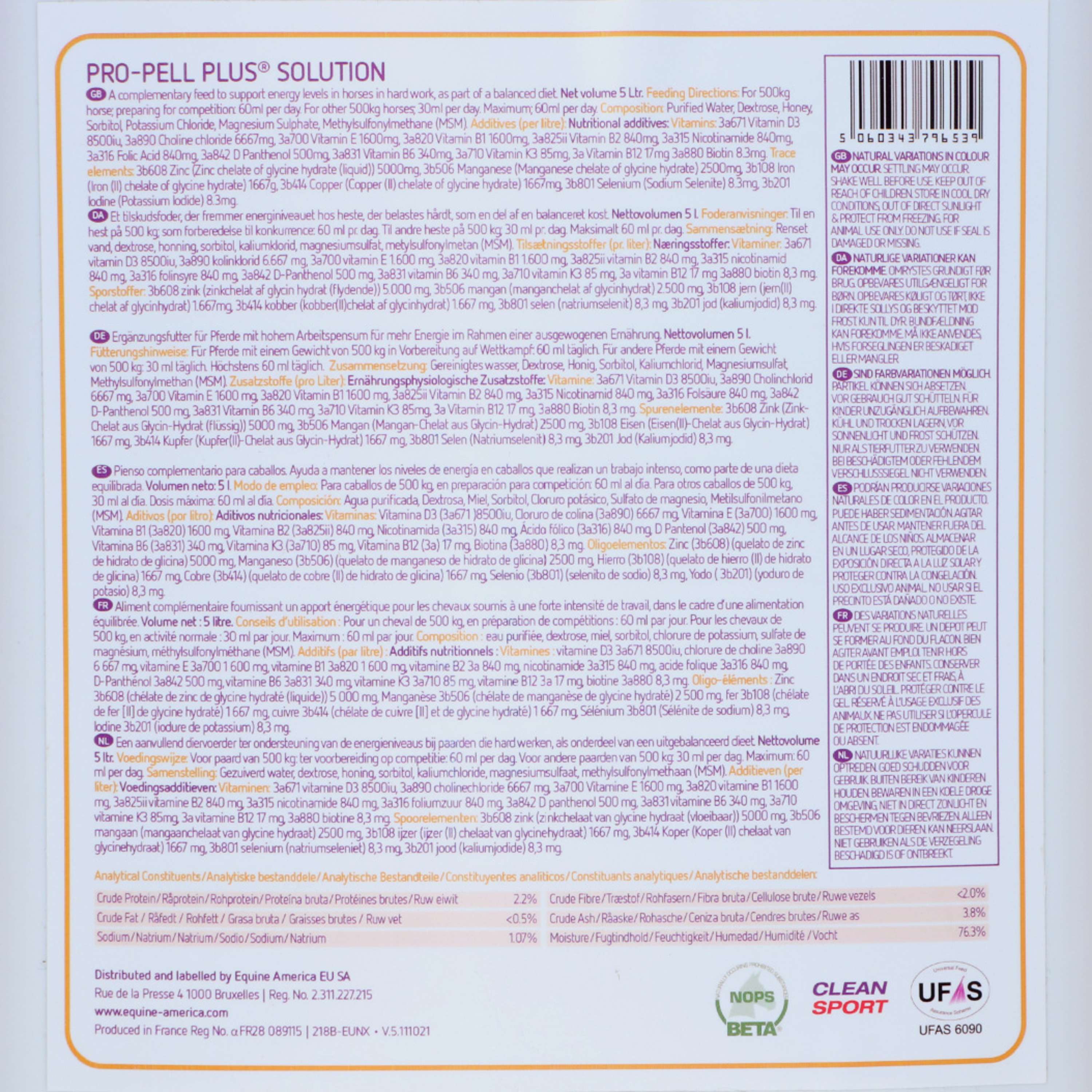 Das Ergänzungsfuttermittel enthält viel Eisen, Multivitamine, Mineralstoffe und Echinacea zur Aufrechterhaltung des Eisengehalts im Blut. Das Ergänzungsfuttermittel ist flüssig und leicht zu dosieren. Equine America Propell Plus sorgt für einen effektiven Sauerstofftransport im Blut. Dieses Ergänzungsfuttermittel eignet sich besonders für Pferde, die schwere Arbeit verrichten und an anspruchsvollen Wettbewerben teilnehmen. Auch als Nachbehandlung zu Hämogen für Pferde geeignet, die sich von einem Virus oder einer Anämie erholen. Zutaten: Konservierungsmittel: Ammoniumpropionat – E280 – 1.000 mg/kg. Verdickungsmittel: Xanthangummi – E415 – 4.000 mg/kg. Aroma: Zitronensäure – E330 – 9.000 mg/kg. Vitamine und Provitamine: Niacinimid – 3.100 mg/kg, Thiaminhydrochlorid – 2.400 mg/kg, d-Pantothensäure – 1.700 mg/kg, Riboflavin – 900 mg/kg, Pyridoxinhydrochlorid – 370 mg/kg, Folsäure – 370 mg/kg, d-Biotin – 20 mg/kg, D-Alpha-Tocopherolacetat – 1 mg/kg, Cyanocobalamin – 0,90 mg/kg, Menadion-Natriumbisulfit-Komplex – 80 mg/kg