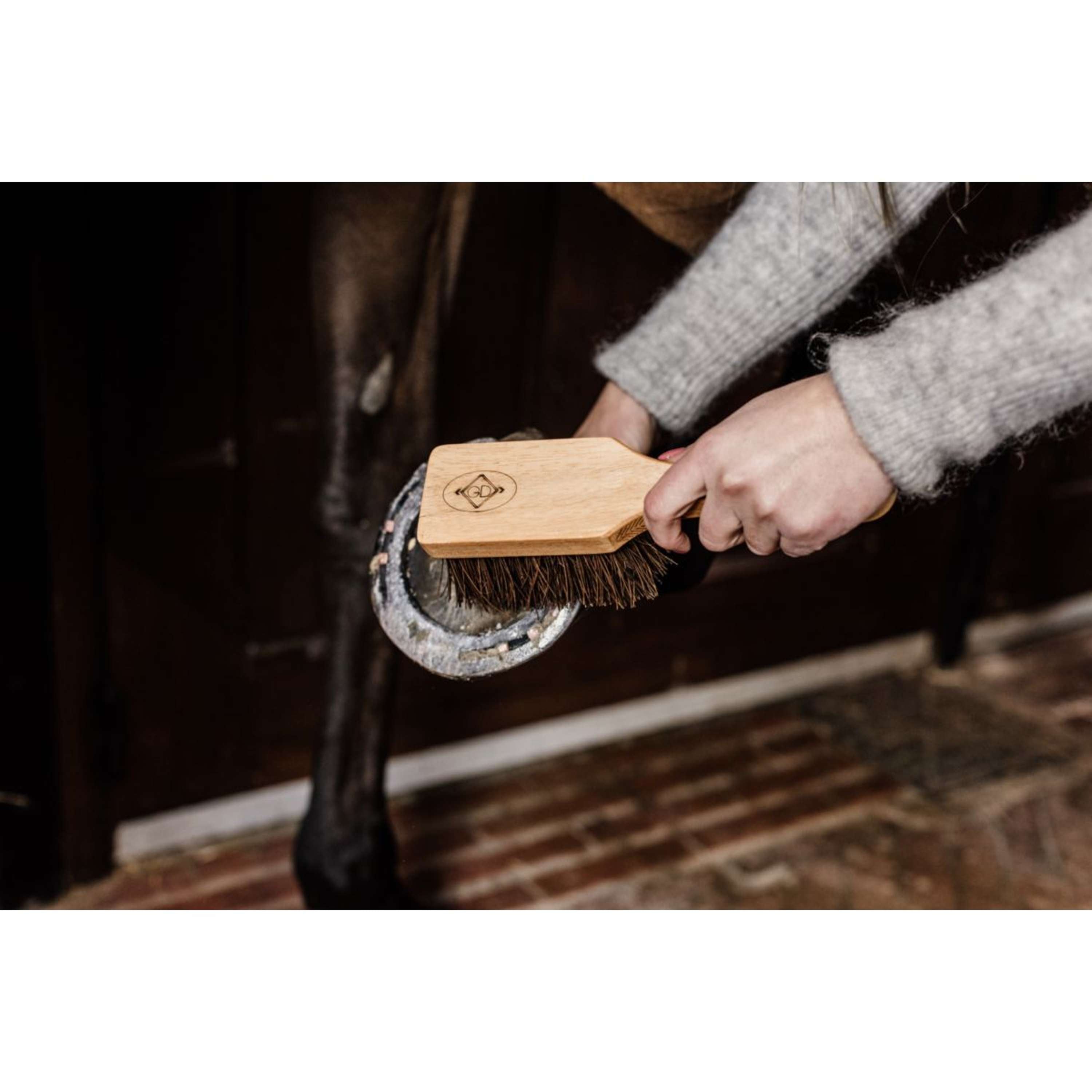 Du hast es satt, hartnäckigen Dreck von den Hufen deines Pferdes zu schrubben? Dann bist du hier genau richtig! Diese lackierte Bürste ist mit natürlich geöltem Palmyra gefüllt, einer besonders festen Faser, die meistens für Besen verwendet wird. Ideal, um Sand und Schlamm mühelos zu entfernen. Der Griff sorgt dabei für einen optimalen Halt, sodass du jederzeit die Kontrolle behältst. Reinige die Bürste einfach mit warmem Seifenwasser, damit sie lange hält. Dein Pferd wird im Stall zum Hingucker!
