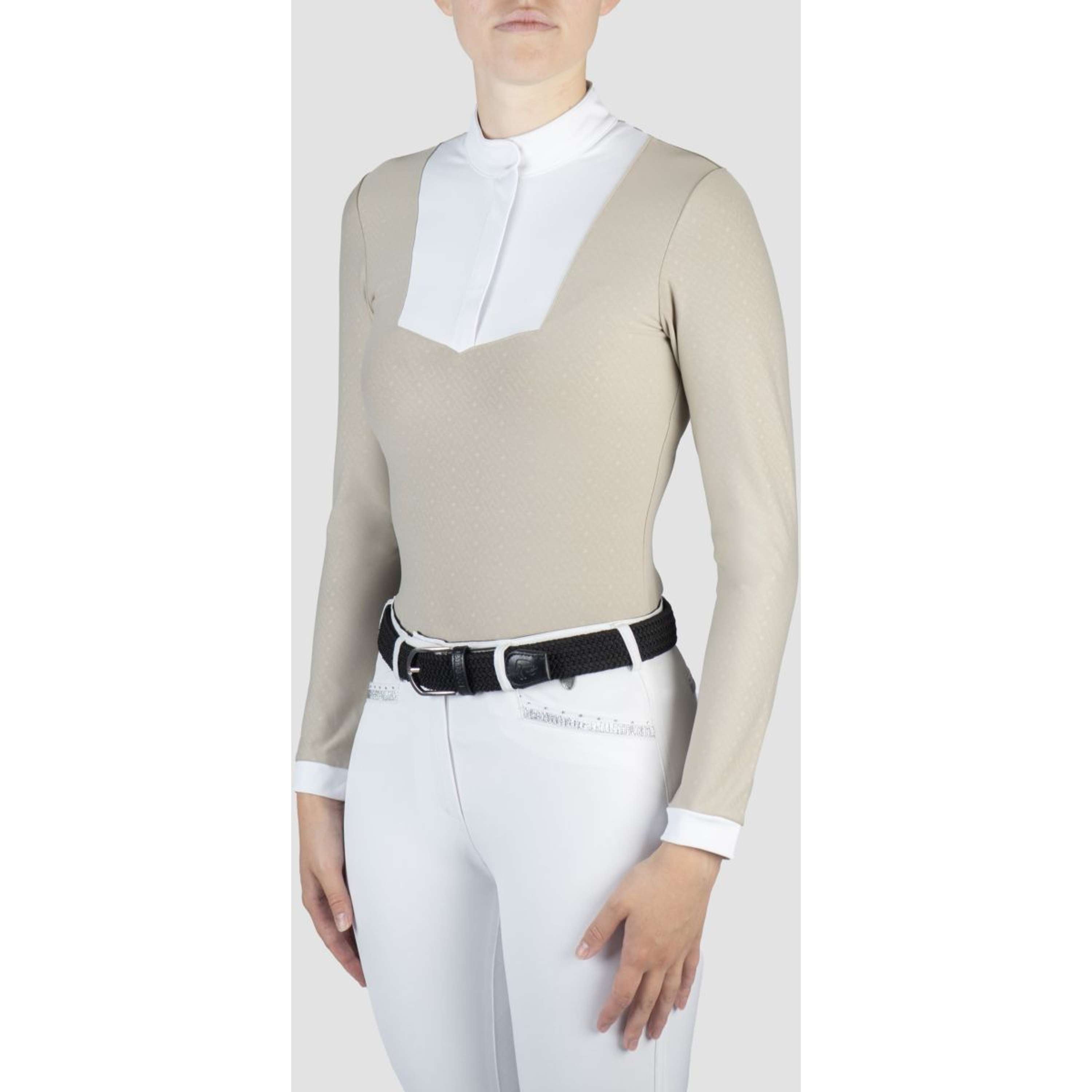 Das Turniershirt kommt mit einer weißen Kragen, der dem gesamten Outfit einen klassischen Touch verleiht. Der verdeckte Reißverschluss ist praktisch und lässt das Shirt noch eleganter aussehen. Egal ob auf dem Turnierplatz oder beim Training, mit diesem Shirt bist du immer gut gekleidet.