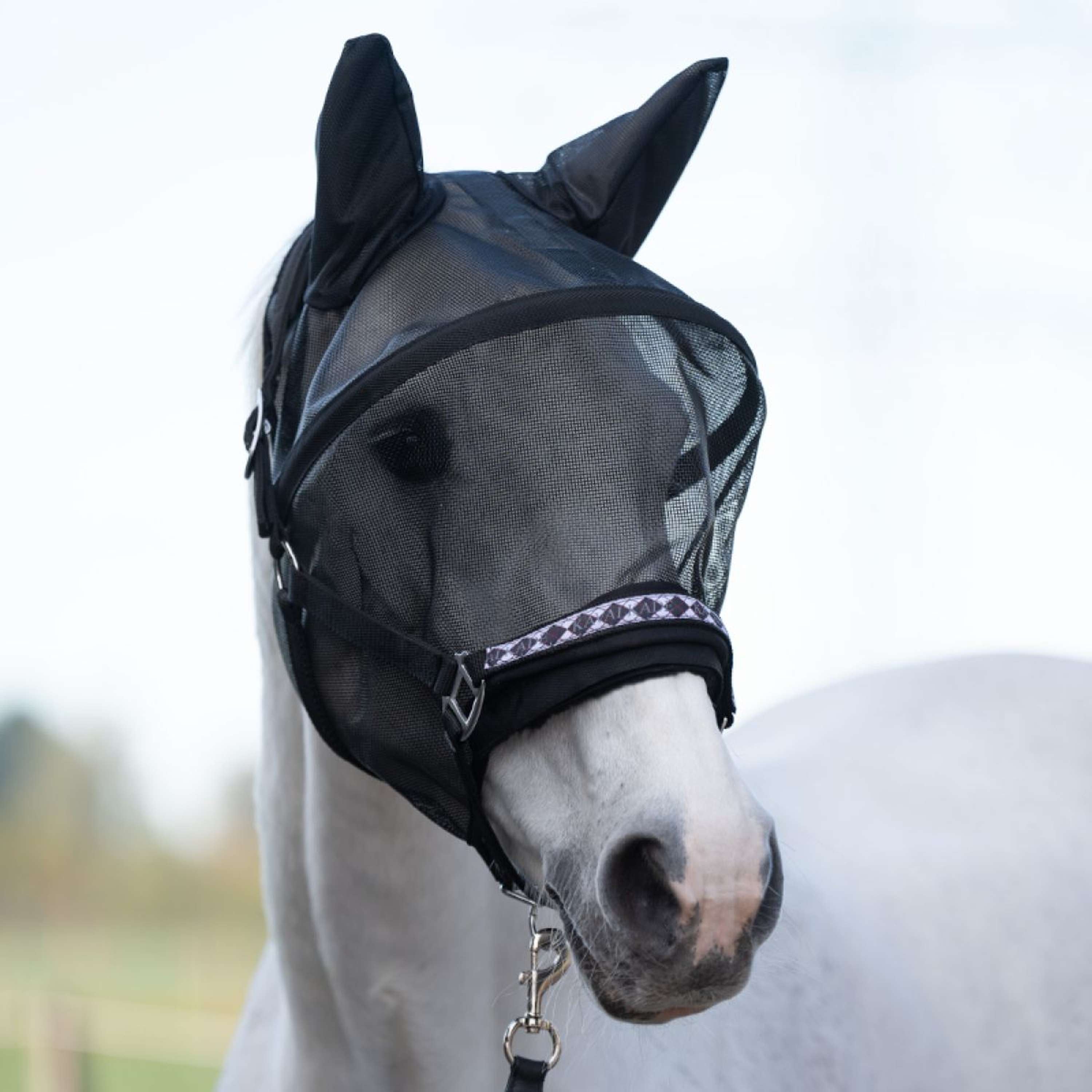 Der angenähte Schlauch im Genickbereich ermöglicht die einfache Durchführung des Halfters. Die weichen, luftdurchlässigen Ohren und das mit Kunstfell gepolsterte Nasenstück machen die Maske besonders angenehm für dein Pferd.
