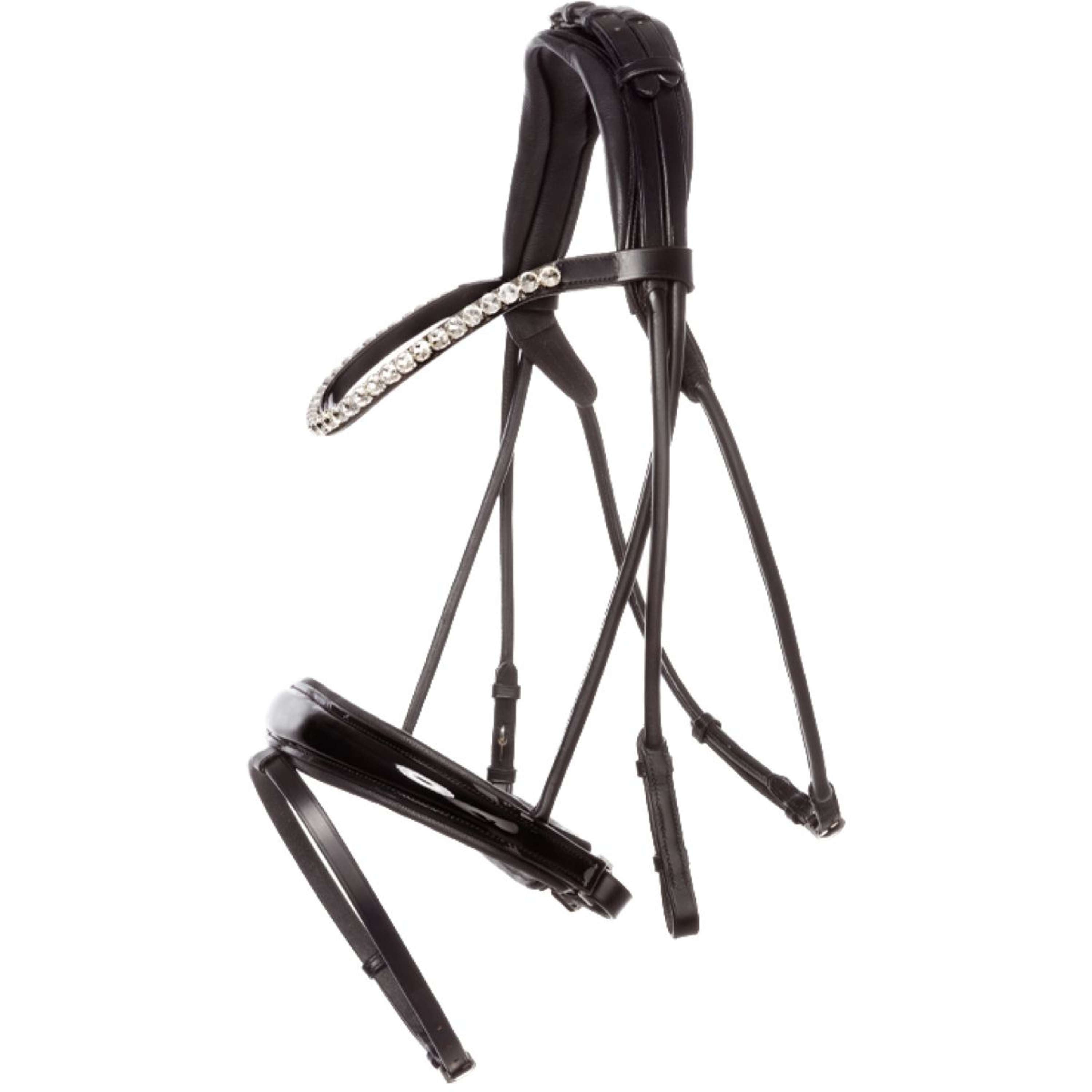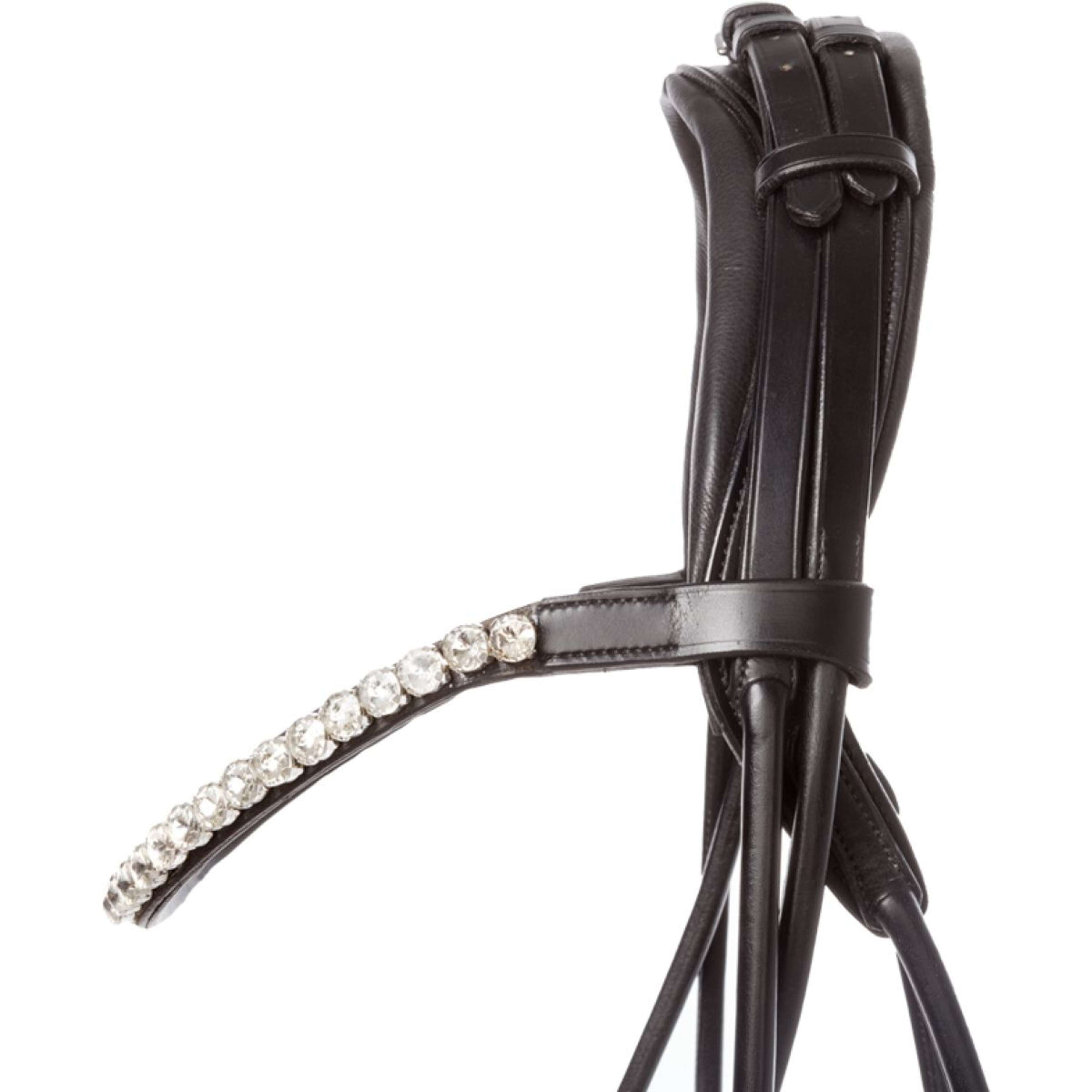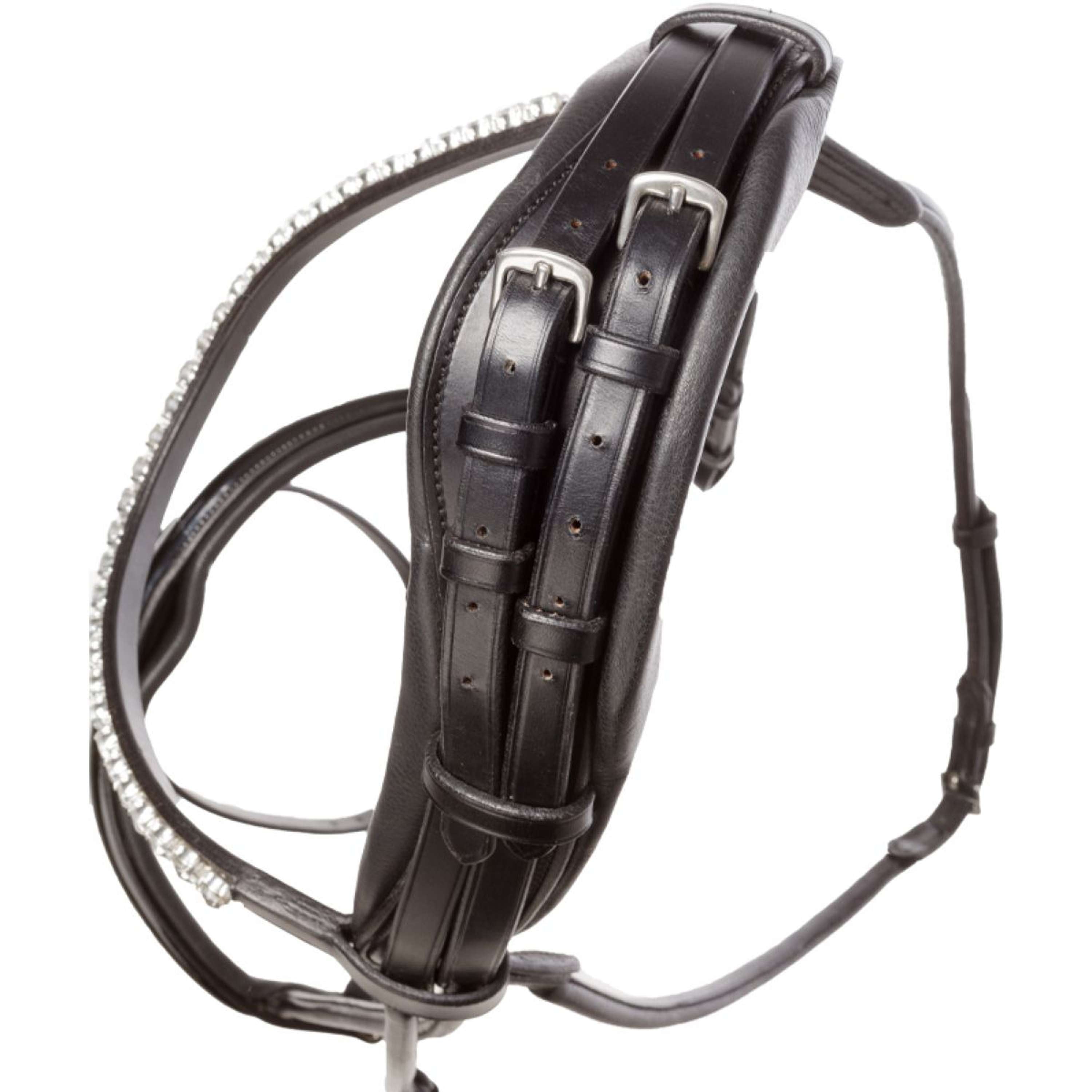 Die Florina KavalSH4 überzeugt durch ihre rundgenähten Seitenriemen, das geschwungene Stirnband mit großen weißen Strasssteinen und den breiten Nasenriemen mit Lack. Alles zusammen lässt dein Pferd einfach einzigartig aussehen.