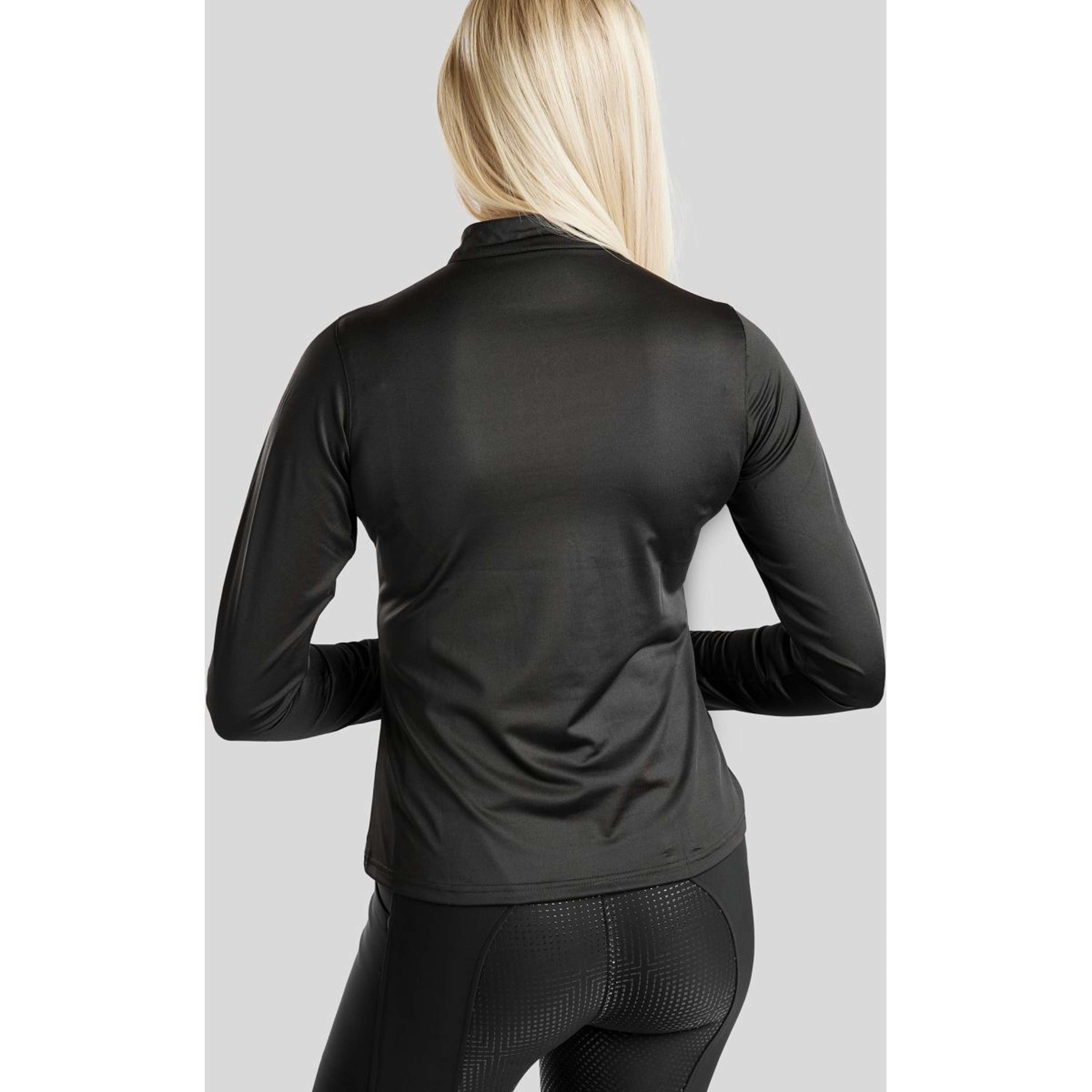 Das schwarze Polo kommt mit langen Ärmeln und einem niedrigen Stehkragen. Auf der Vorderseite findest du einen silbernen Nackenreißverschluss. Auf der linken Brustseite prangt ein Montar-Logo aus klaren Kristallen mit einem Durchmesser von 4 cm - ein schickes Detail, das dein Outfit aufwertet.