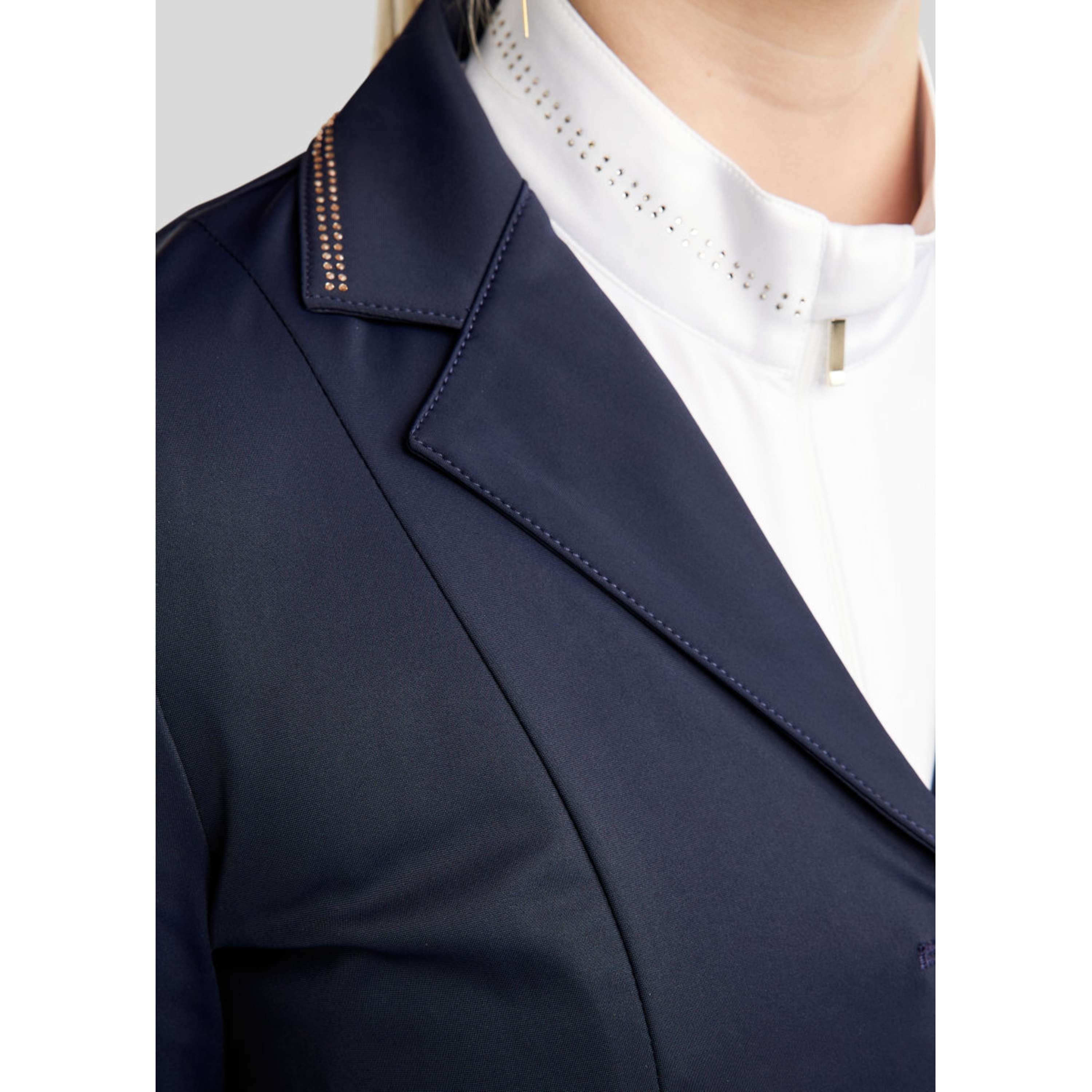 Die Showjacke zeichnet sich durch ein schönes und luxuriöses Erscheinungsbild aus, mit zwei Reihen champagnerfarbener Kristalle sowohl am Kragen als auch an den Bereichen rund um die Taschen. Unter den Taschenklappen befindet sich ein zusätzliches Kristallset, mit dem Sie wählen können, ob die Klappe sichtbar oder versteckt sein soll. Die champagnerfarbenen Knöpfe vorne vervollständigen den exklusiven Look, und darunter befindet sich ein praktischer Reißverschluss, der für eine glatte und gut sitzende Silhouette sorgt.