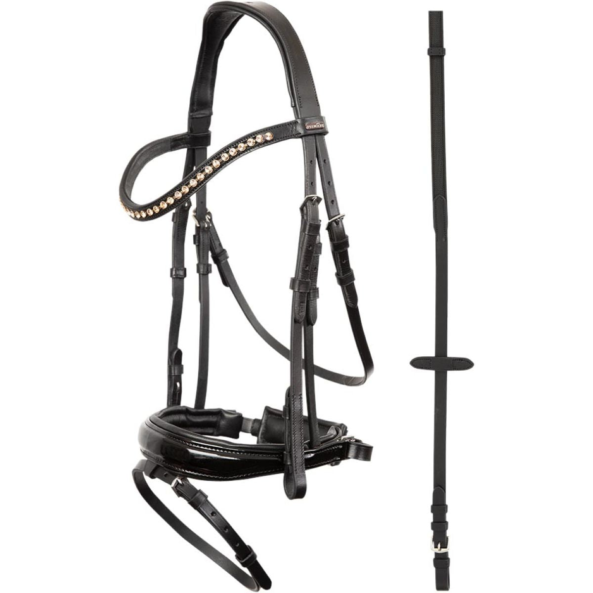 Der Nasenriemen ist in elegantem Lackleder gehalten, während das leicht gebogene Stirnband mit einer Silberkette und funkelnden Strasssteinen in der Farbe Basil Peach verziert ist. So wird dein Pferd zum echten Blickfang!