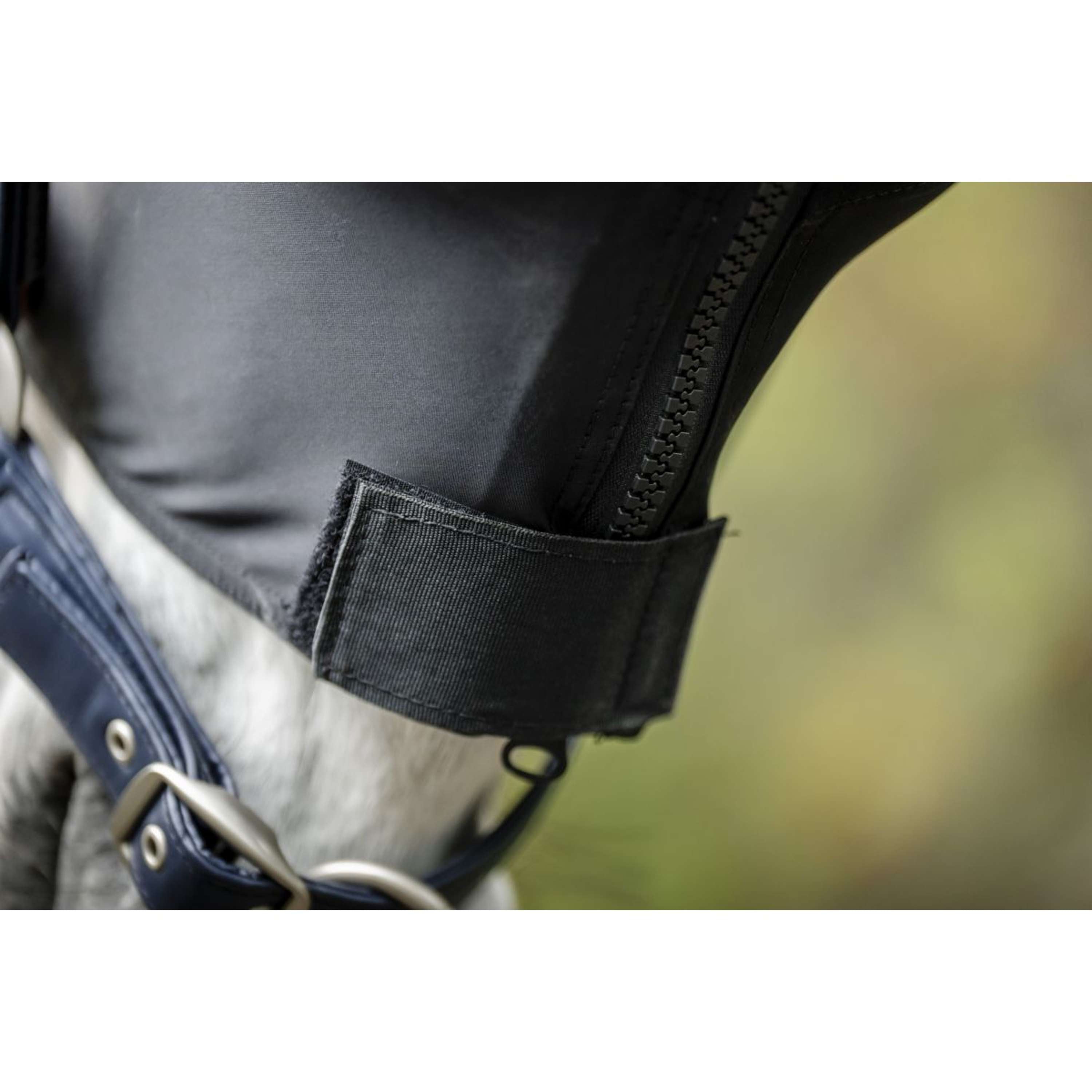 Einfach zu bedienendes Reißverschlusssystem mit verstärktem Reißverschlussschutz für Gesicht, Hals, Brust- und Bauchklappe mit einfachem Velcro-Verschluss für die Hinterbeine.