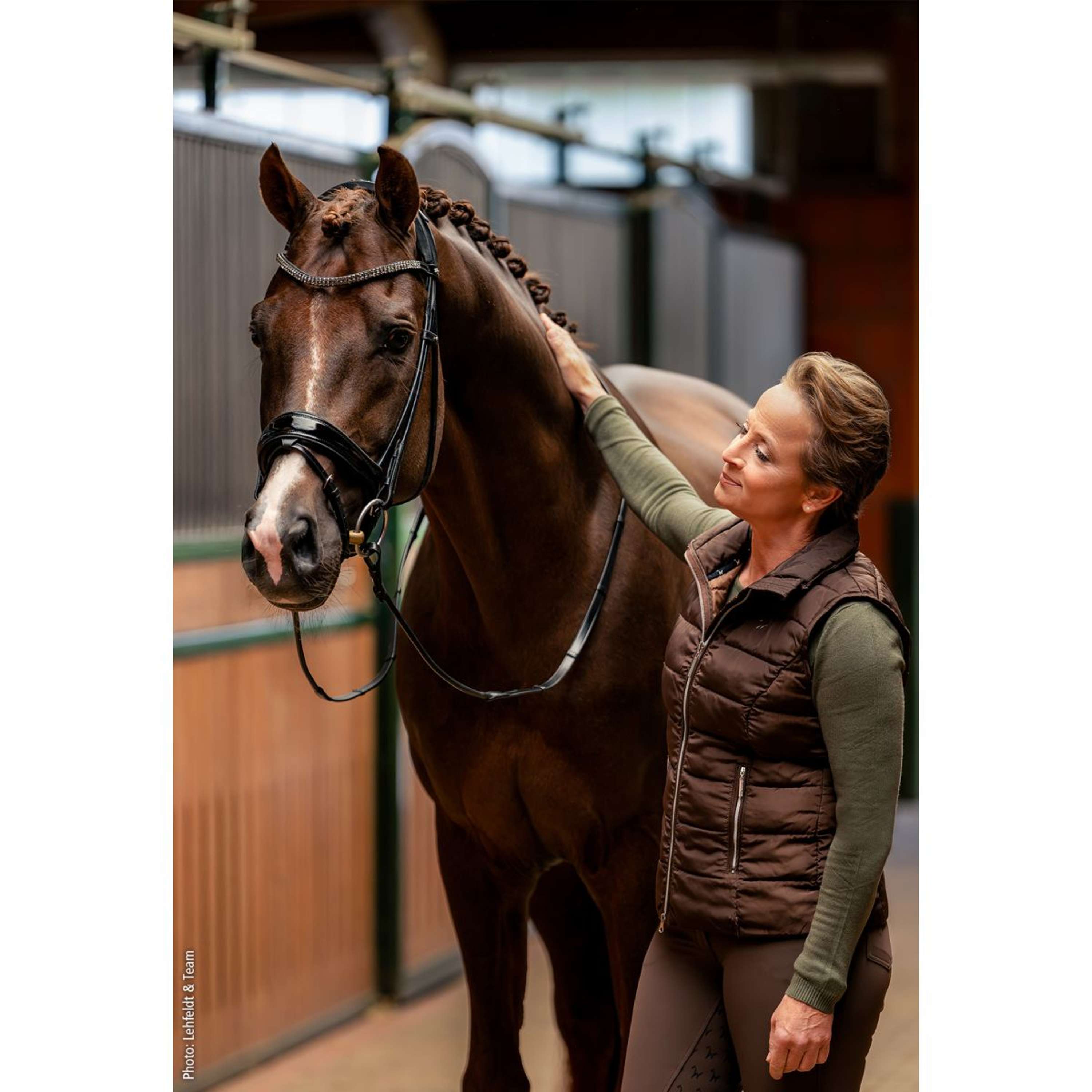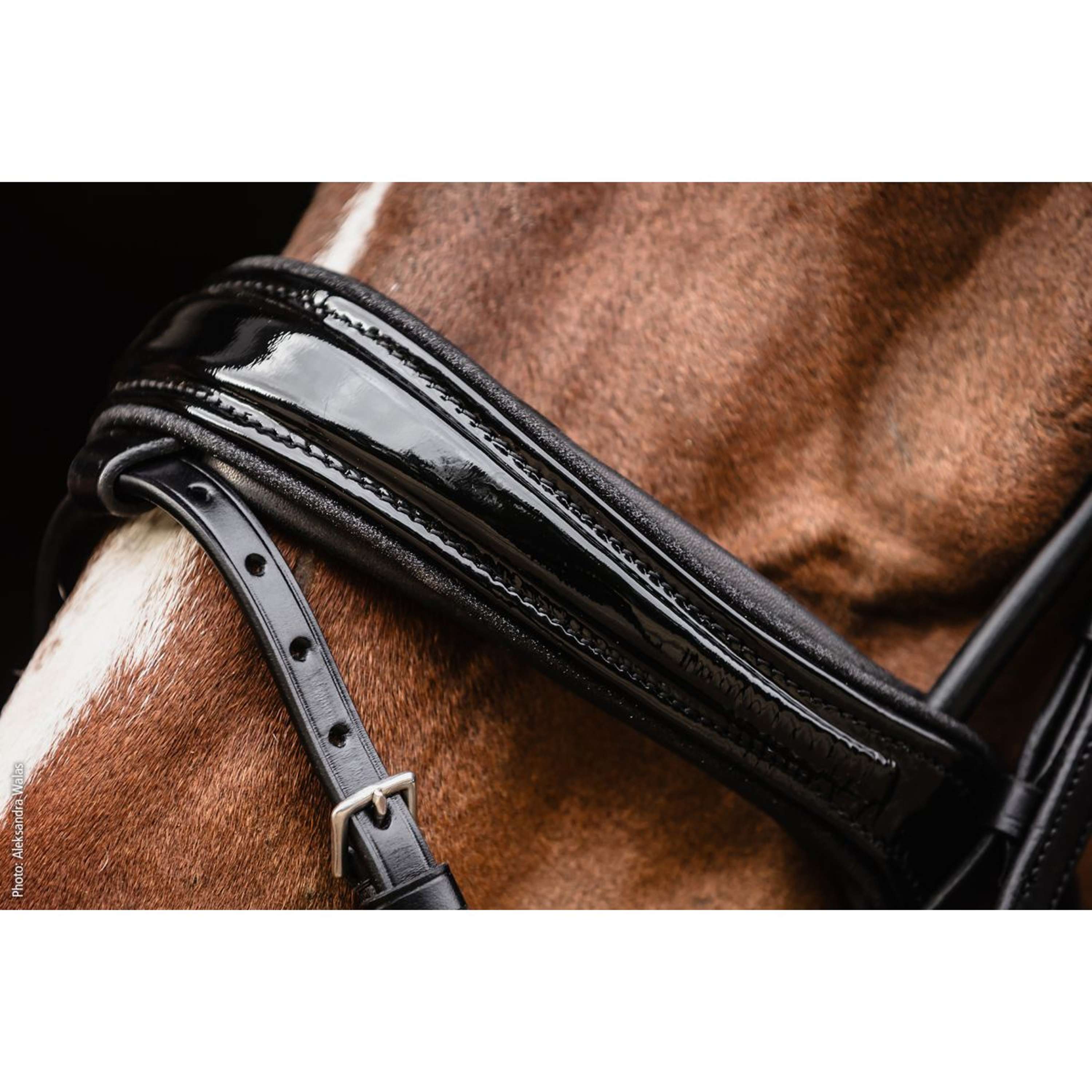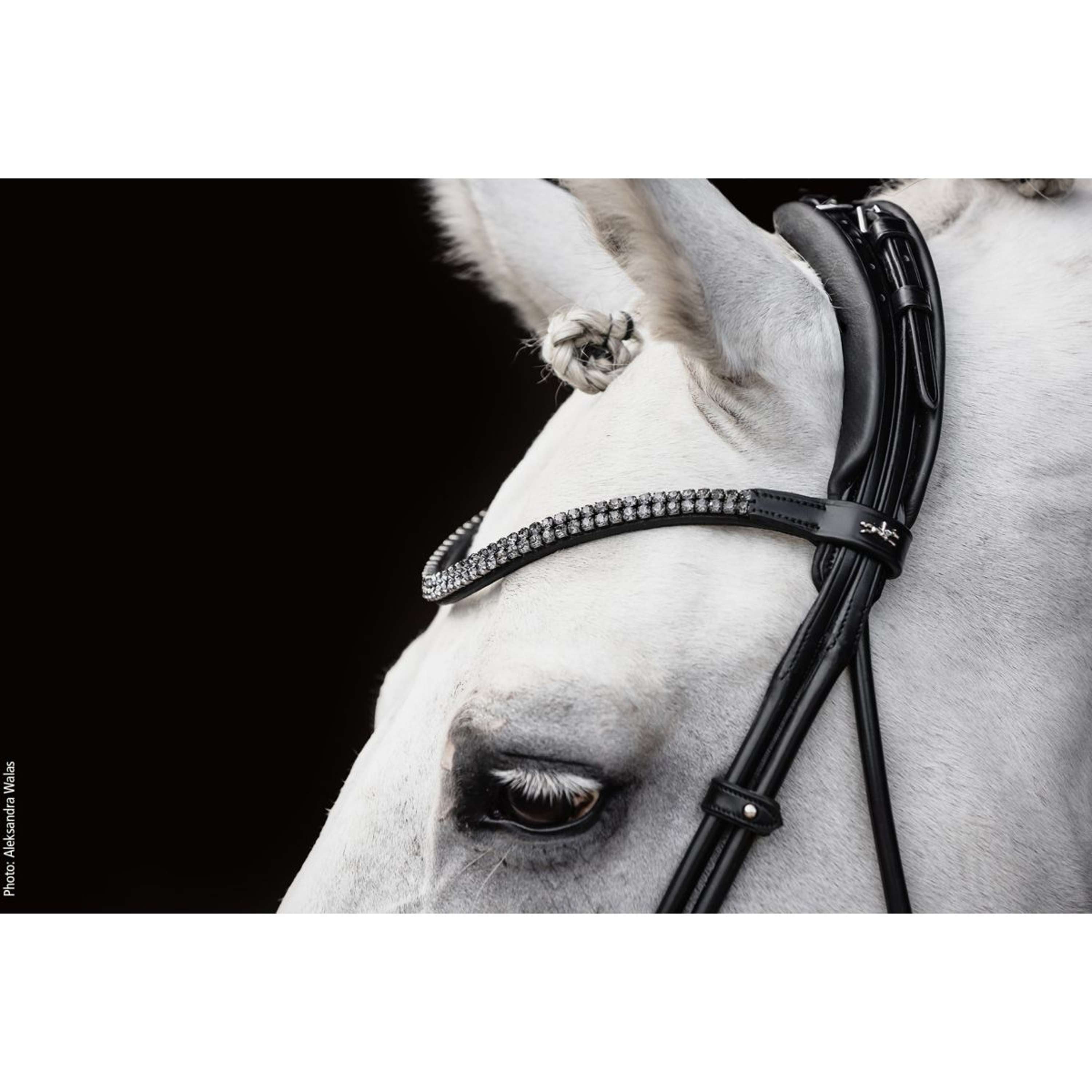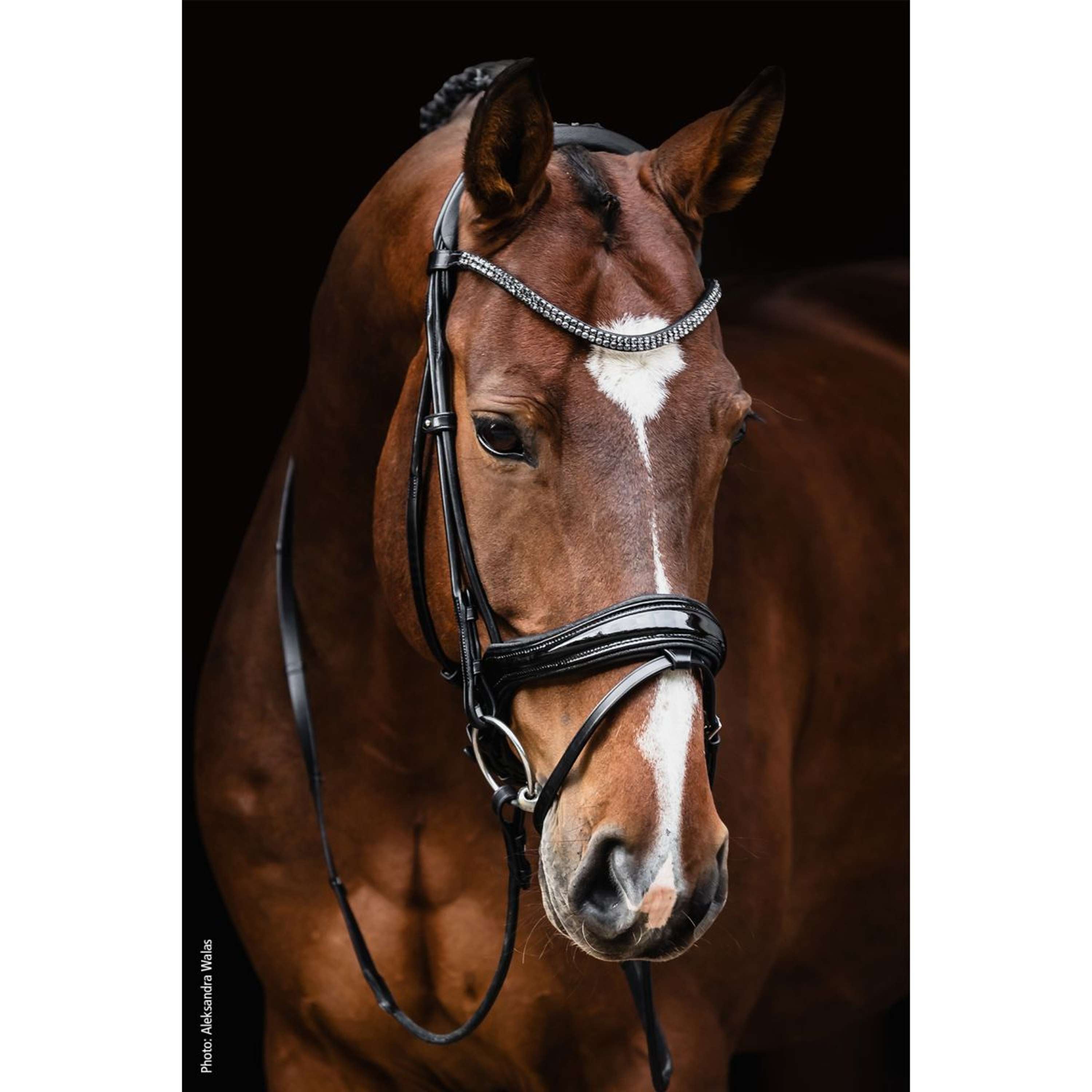 Ein schmales Stirnband mit zwei Reihen funkelnder, eckiger Kristalle verleiht dem Gesamtbild das gewisse Extra. Für einen besonders stilvollen Auftritt sorgt die Lack-Variante mit feiner Paspel – edel, ohne aufdringlich zu wirken. Als besonderes Highlight wird die Kandare mit einer exklusiven Isabell Werth Trensentasche aus Samt geliefert.